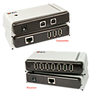 The Extender is a two part hardware solution comprising a transmitter with an integrated 3 port USB hub and a receiver with 7 port USB hub for connecting the USB devices.