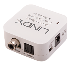 The Lindy SPDIF Converter and Repeater allows the user to input digital audio through a Coaxial or optical port and output digital audio simultaneously through Coaxial and optical ports, for dual audio functionality, avoiding the need for two separate audio converters, and a high resolution listening experience of movies, games and music.